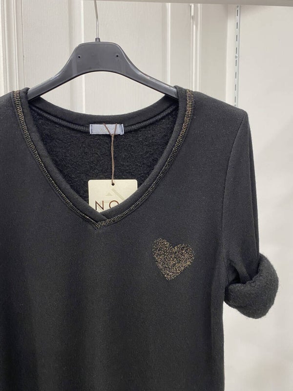 Pull en v molleton COEUR uni col lurex doré NOIR ,taille unique(36-40).